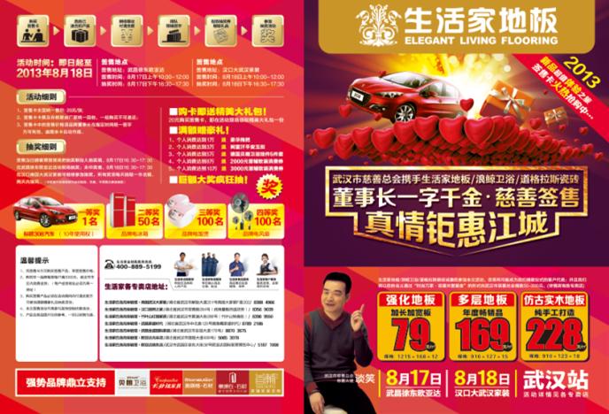 為回饋廣大消費(fèi)者對(duì)生活家地板品牌多年來(lái)的信賴與支持,武漢市慈善總會(huì)攜手生活家地板共同舉辦董事長(zhǎng)慈善簽售會(huì),一字千金,真情回饋江城消費(fèi)者。