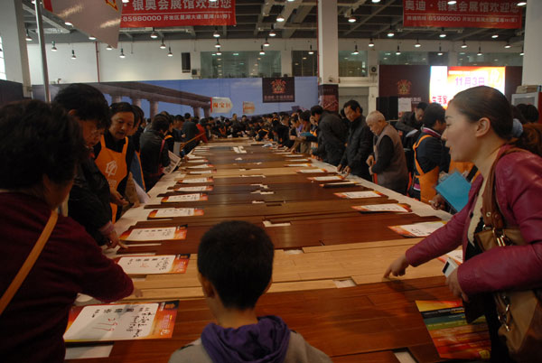 清晨風和日麗,預報的小雨不見蹤影,預示著一天好的開始。不到9點就有來自南通四面八方的消費者來到活動的舉辦地點:南通體育會展中心。唯一的活動入口人越聚越多,在安保人員的指揮下排好隊伍。10點大門打開,已經有點躁動的人流象潮水般涌進了會場。而來自鹽城、張家港以及南通地區各縣市的消費者乘坐的大巴也到了會展中心。一時,現場人流如潮,每處樣板展區前都是人頭攢動。