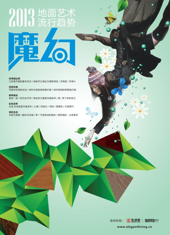 從近年來《指環王》、《哈利波特》等一系列魔幻影片的熱映,強烈反映出當代人越來越追求豐富、個性、變幻和超越的精神享受和物質體驗。由生活家地面藝術研究院和《瑞麗》家居共同發布的“2013年度地面藝術流行趨勢”表明:精神世界的“魔幻”情結正在向家居領域漂移,“魔幻”已經成為地面藝術流行趨勢的關鍵詞。 生活家地面藝術研究院負責人表示,更多創意和設計元素進入地面藝術領域,引發了地面藝術的巨大變革,無論是從造型、色彩、圖案的表現,還是到功能元素的結合與應用,都為“魔幻”地面藝術的實現和流行創造了條件。