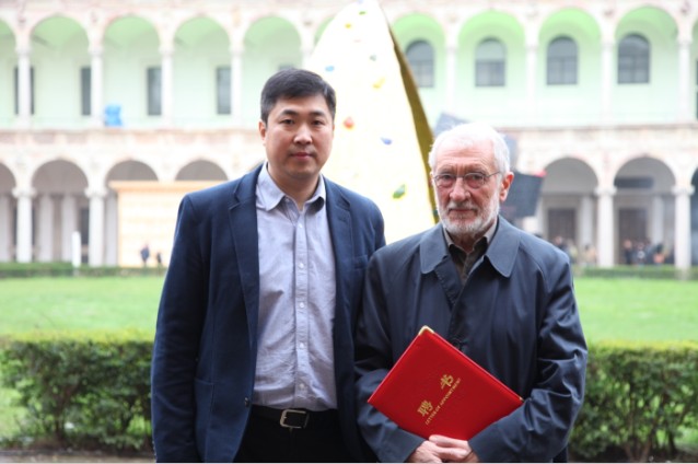 (弗蘭西斯克?門迪尼[右]從生活家地面藝術研究院院長楊冬江[左]手中接過聘書)